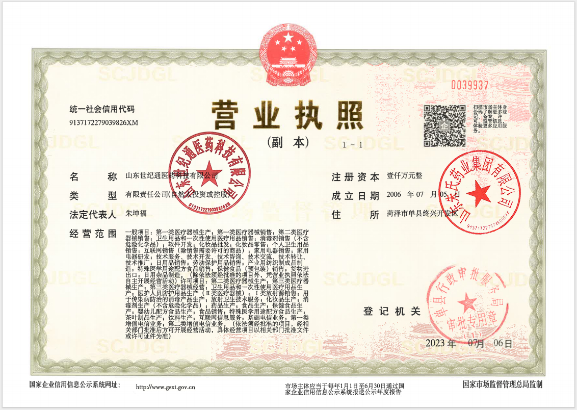 山东世纪通医药科技有限公司成立于2006年初,是集新药研究,医疗器械、保健品的开发、生产、销售 为一体的健康产业集团公司。公司坐落在素有“中原锁钥,四省通衢”之称的山东鲁 西南——单县。单县历史源远流长,文化底蕴丰厚,是著名的武术之乡,戏曲之乡,书画之乡,也是儒家文化 的发祥地之一。我们秉持一颗真诚、包容、严谨、感恩之心善待每一个合作客户、每一个消费者。